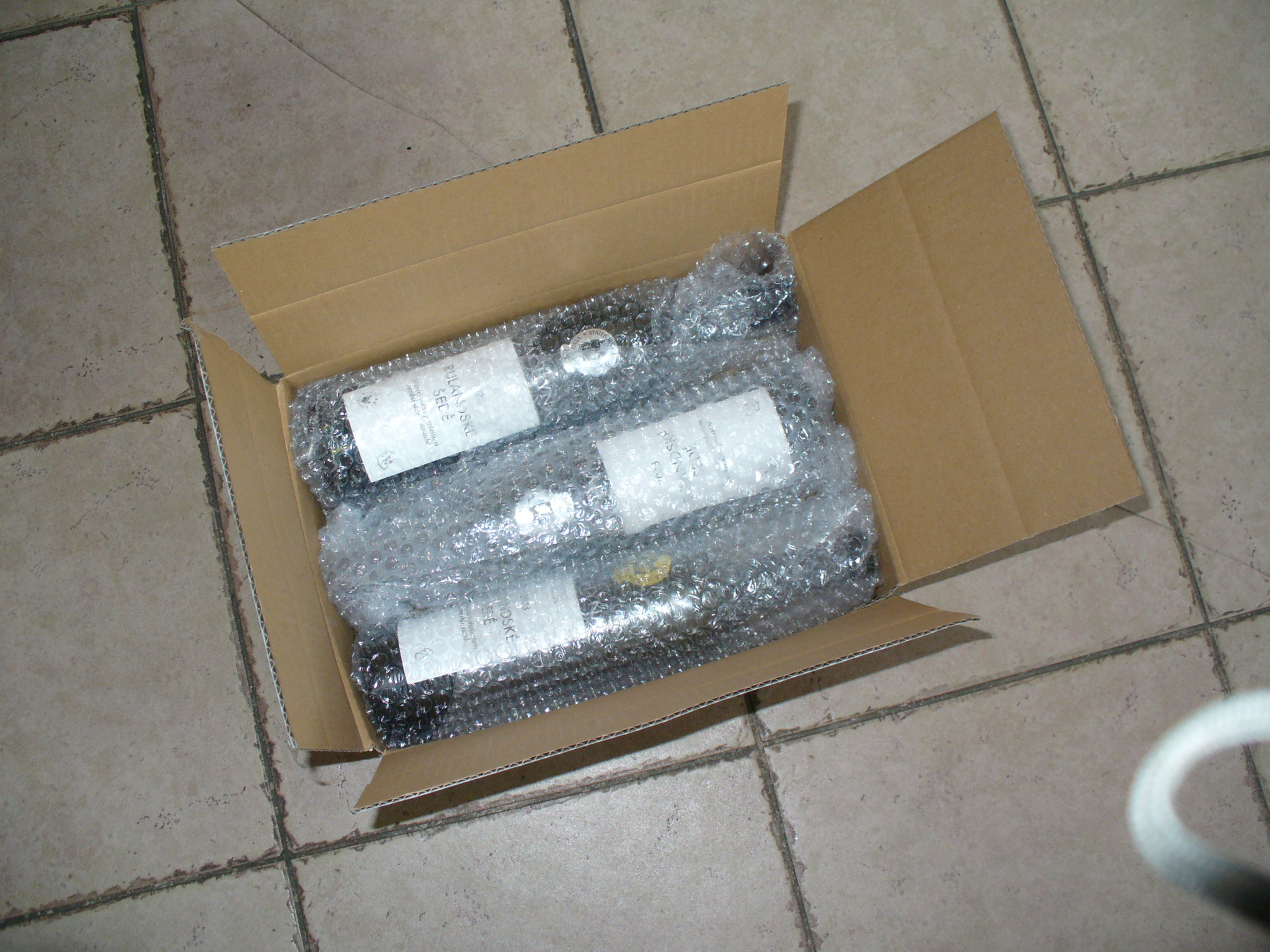 Každou láhev balíme samostatně do bublinkové fólie, následně do kartonu na víno a pak do krabice z velmi odolného kartonu. Takže lahve jsou dobře chráněny před nevhodným zacházením s balíkem při přepravě a neublíží jim ani nechtěný pád balíku z metrové výšky.